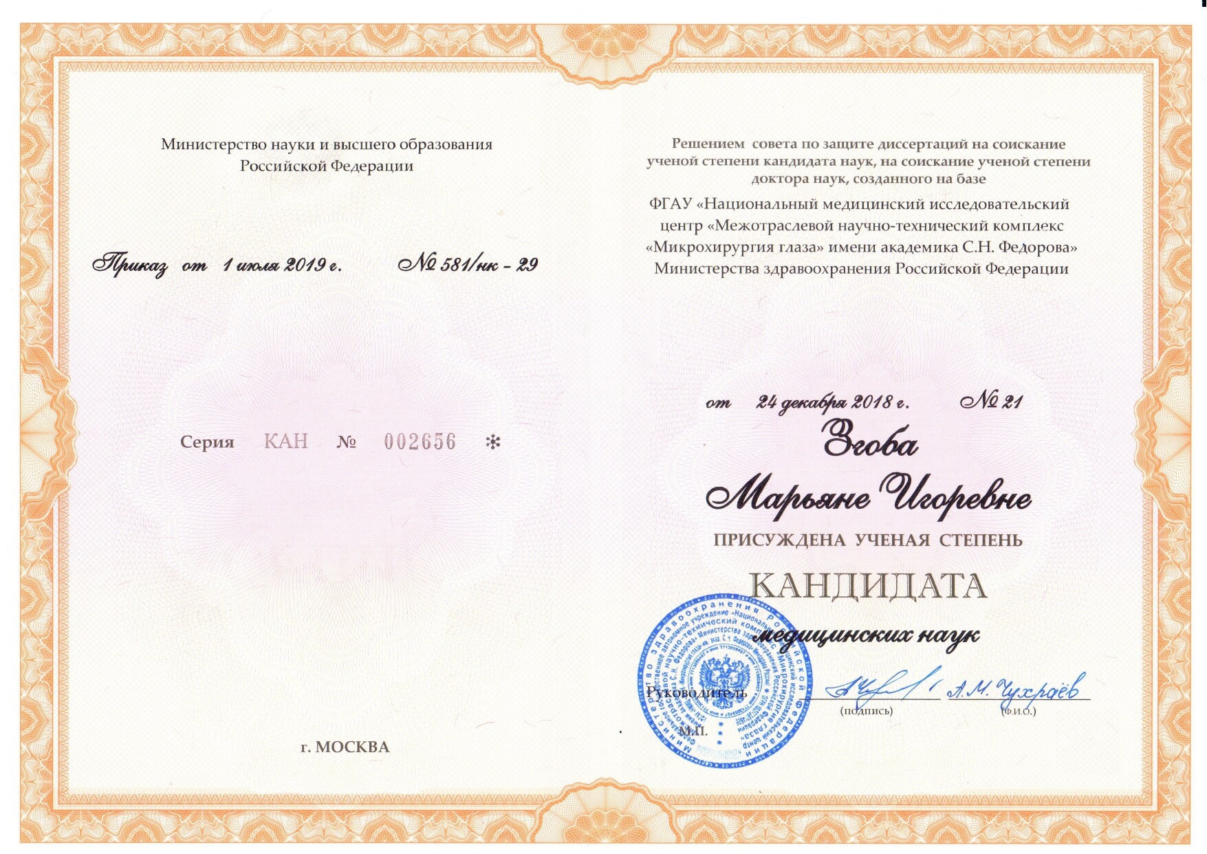 2014 -2017 аспирантура в отделе витреоретинальной хирургии и диабета глаза ФГАУ «НМИЦ МНТК «Микрохирургия глаза» им. акад. С.Н.Федорова»